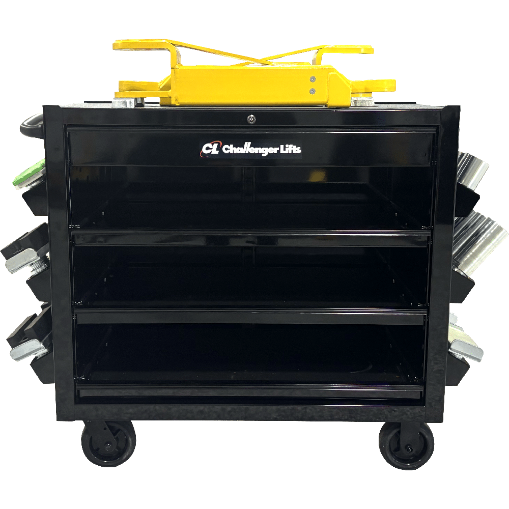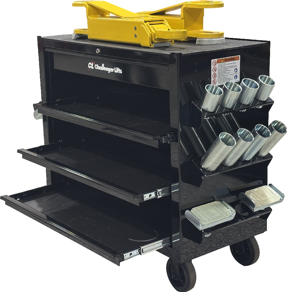The Challenger Lifts Adapter Cart is designed to streamline bay workflow by keeping adapters, footpads, and spacers exactly where technicians need them. With organized storage and easy mobility, the cart reduces setup time, minimizes downtime, and helps maintain a clean, efficient shop environment.