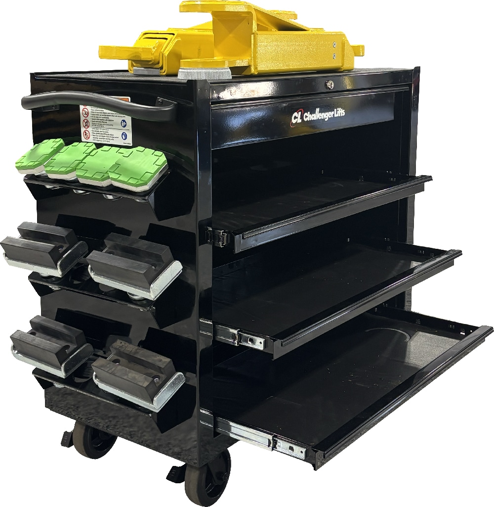 Durable, mobile cart designed to store and transport lift adapters and accessories throughout the shop.